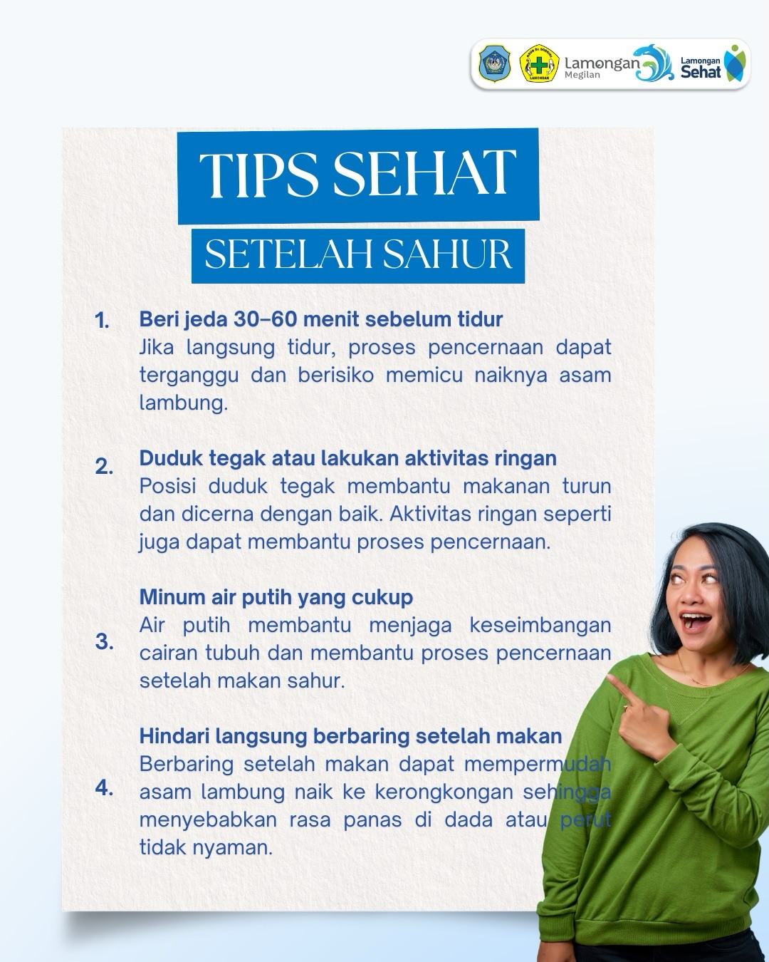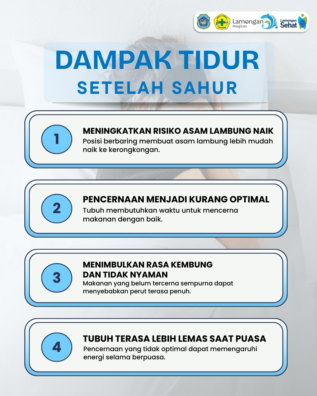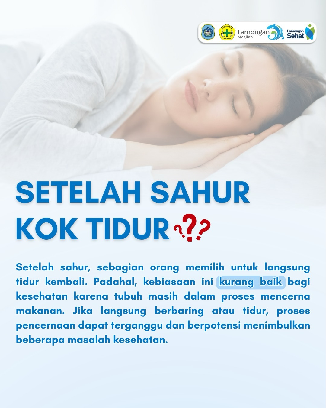 Tidur lagi setelah sahur ternyata adalah kebiasaan yang kurang baik untuk kesehatan. Saat selesai makan sahur, tubuh masih membutuhkan waktu untuk mencerna makanan. Jika langsung berbaring atau tidur, proses pencernaan bisa terganggu dan berisiko menyebabkan asam lambung naik, perut kembung, hingga rasa tidak nyaman saat berpuasa.
