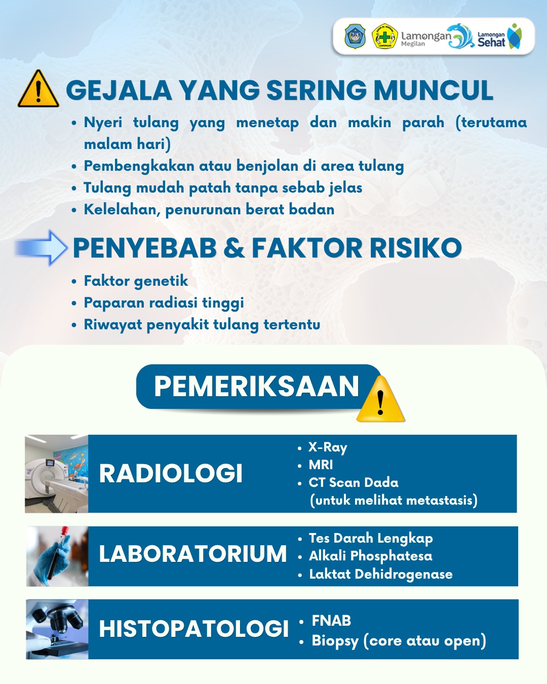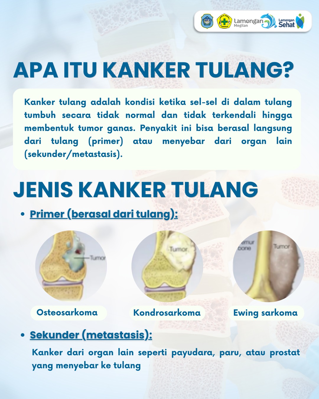 Kanker tulang dapat menyebar ke organ lain, terutama paru-paru (metastasis), sehingga penting untuk mengenali gejalanya sejak dini. Waspadai nyeri pada tulang yang tidak kunjung hilang, semakin terasa berat, atau disertai munculnya benjolan—ini bisa menjadi tanda yang perlu diperhatikan. Jangan menunggu hingga keluhan memburuk, yuk lakukan deteksi dini demi kesehatan yang lebih baik!