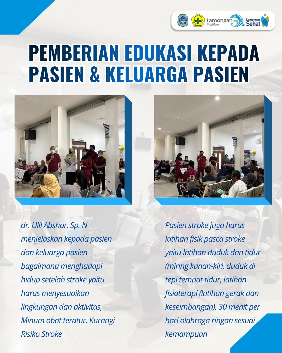 Dalam upaya meningkatkan pemahaman masyarakat mengenai pentingnya perawatan lanjutan bagi pasien stroke, RSUD Dr. Soegiri Lamongan menggelar kegiatan Promosi Kesehatan Rumah Sakit (PKRS) dengan tema Perawatan Pasca Stroke. Kegiatan ini menghadirkan narasumber dr. Ulil Abshor, Sp.N., dan diikuti oleh pasien serta keluarga pasien yang berada di poli saraf.
