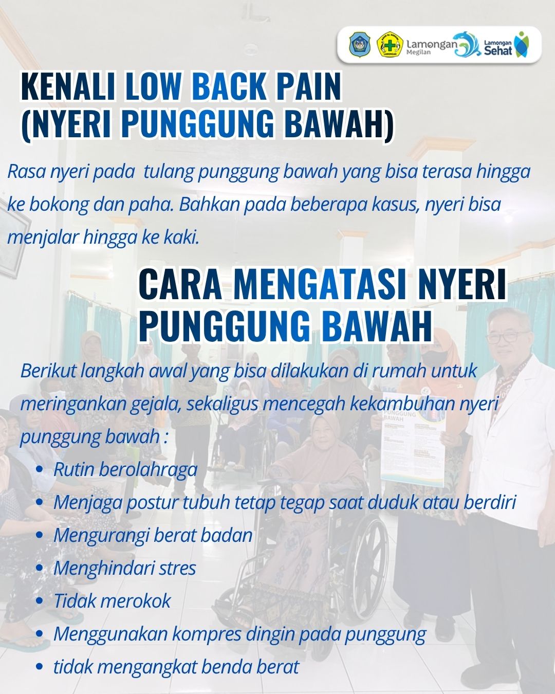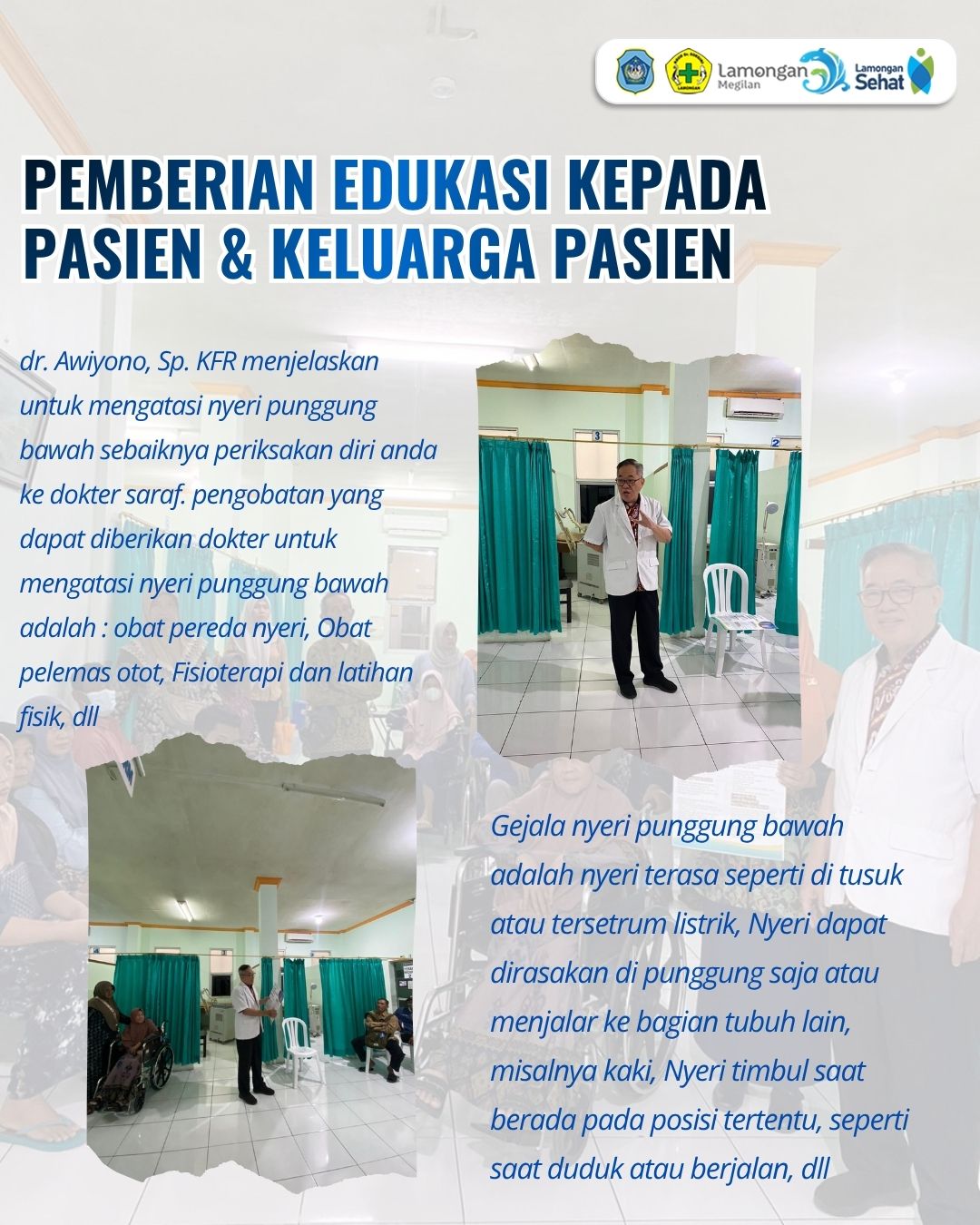 Dalam upaya meningkatkan edukasi kesehatan kepada masyarakat, RSUD Dr. Soegiri Lamongan menggelar kegiatan Promosi Kesehatan Rumah Sakit (PKRS) dengan topik Low Back Pain (LBP) atau nyeri punggung bawah bersama dr. Awiyono, Sp.KFR. Kegiatan ini dilaksanakan di ruang Instalasi Rehab Medik mulai pukul 08.00 WIB hingga selesai.